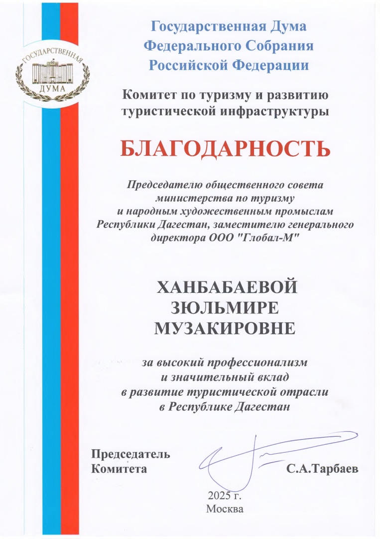 Заместитель директора управляющей компании ООО «Глобал-М» награждена Благодарностью Комитета по туризму и развитию туристической инфраструктуры Государственной Думы Федерального Собрания Российской Федерации за высокий профессионализм.